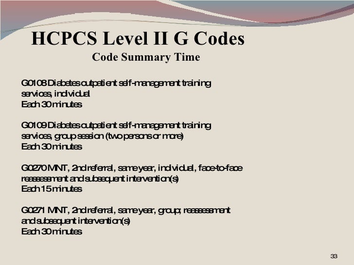 Diabetes self-management training (dsmt) cpt code g0108 dsmt, individual session, per 30 minutes cpt g0109 dsmt, group session (2 or more), per 30 minutes 97802medical nutrition indiv in average fee payment $30 $40 no specific diagnosis code contact the local medicare contractor for guidance medicare beneficiaries diagnosed with diabetes must be ordered by the physician or. Multiple units of the codes can be used based on medical necessity and the complexity of the mnt decision-making. g0270 medical nutrition, reassessment, individual, each 15 minutes. g0271 medical nutrition, reassessment, group, each 30 minutes. g0108 diabetes outpatient self-mgmt training service, individual, per 30 minutes. Multiple units of the codes can be used based on medical necessity and the complexity of the mnt decision-making. g0270 medical nutrition, reassessment, individual, each 15 minutes. g0271 medical nutrition, reassessment, group, each 30 minutes. g0108 diabetes outpatient self-mgmt training service, individual, per 30 minutes. Accurately code for specificity and level to ensure that claims can be processed in an orderly, consistent and timely manner. most, but not all, private payors have adopted medicare’s healthcare common procedure code system (hcpcs) level ii, g codes g0108 and g0109 for dsmt.